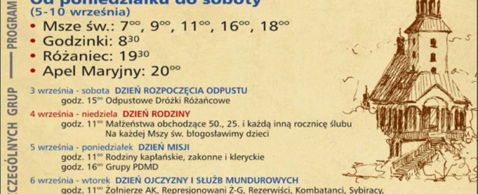 W sobotę, dnia 03 września 2022r., rozpoczyna się Tygodniowy Odpust w Sanktuarium Matki Bożej w Zawadzie. Kustosz wraz z parafianami serdecznie zapraszają do udziału w uroczystościach odpustowych. Msze Święte codziennie o godz. 7.00, 9.00, 11.00, 16.00 i 18.00, a w niedziele: 6.00, 7.00, 9.00, 11.00, 16.30 i 18.00. W programie odpustu nabożeństwa m.in. w intencji