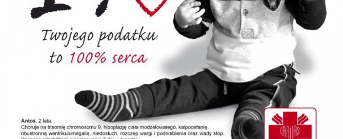 Przekaż 1% swojego podatku na Caritas Diecezji Tarnowskiej a pieniądze trafią na cele społeczne. Caritas Diecezji Tarnowskiej KRS: 0000211791 W minionym roku dzięki 1% wsparto leczenie 126 osób (678066 zł) dofinansowano rehabilitację 118 osób (128784 zł), zakup leków dla 424 osób(101862), dofinansowanie sprzętu medycznego (36553 zł), dofinansowanie 6 placówek opiekuńczo wychowawczych (479504 zł). Dziękujemy, że