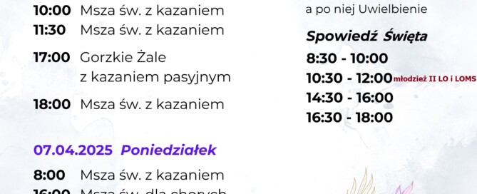 REKOLEKCJE DLA SZKÓŁ PODSTAWOWYCH W PARAFII KRZYŻA ŚWIĘTEGO W DĘBICY. TERMIN: 10.04 – 12.04.2025 r. MIEJSCE: Kościół Krzyża Świętego w Dębicy PROGRAM: 10.04.2025 r. (czwartek): 9.00 – 9.45 - klasy: 1 – 3 10.00 – 10.45 - klasy: 4 – 5 11.00 – 11.45 - klasy: 6 – 8. 11.04.2025 r. (piątek): 9.00