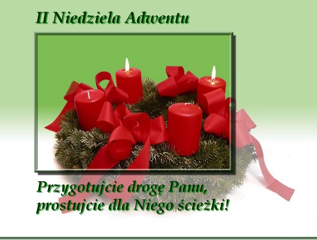 - W II niedzielę Adwentu, Kościół zaprasza nas do nawrócenia i odnowienia serca. Wsłuchajmy się w głos Jana chrzciciela, który woła: „Nawróćcie się, bo bliskie jest królestwo niebieskie”. Niech to wezwanie będzie dla nas zaproszeniem do przemiany serca, abyśmy potrafili rozpoznać i przyjąć Chrystusa, który nadchodzi. Dzisiejsza Eucharystia niech nas umocni w adwentowym oczekiwaniu i przygotuje na spotkanie z Panem, który chce obdarzyć nas pełnią swojej miłości i pokoju.